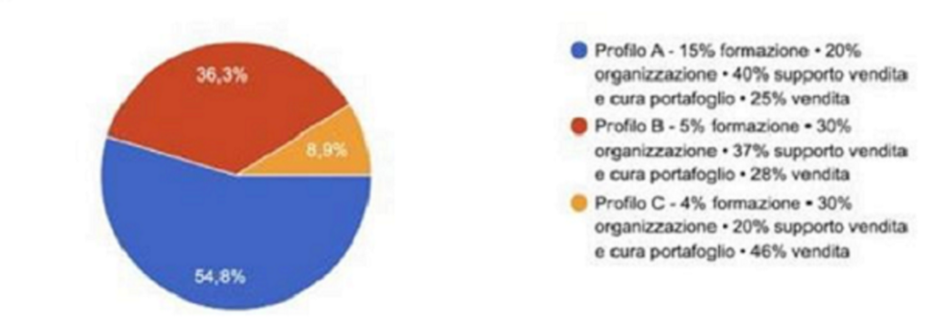 Solo un 8,9% ha raccolto il profilo C in cui si dedica il 4% del tempo alla Formazione, il 30% all’Organizzazione, il 20% al Supporto alla Vendita e cura del portafoglio e il 46% alla Vendita.