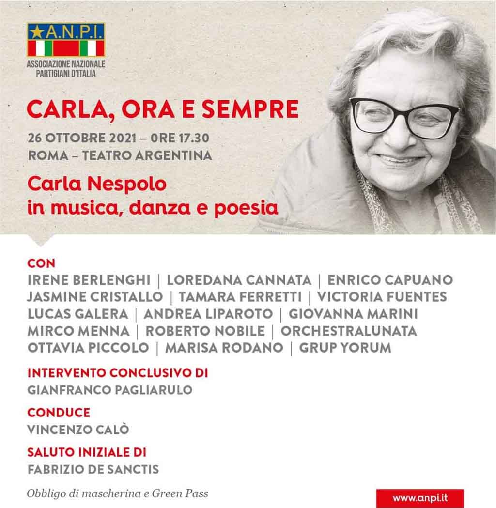 il prossimo 26 ottobre alle ore 17,30 presso il Teatro Argentina si terrà l’evento in ricordo della Presidente Carla Nespolo, scomparsa poco più di un anno fa.