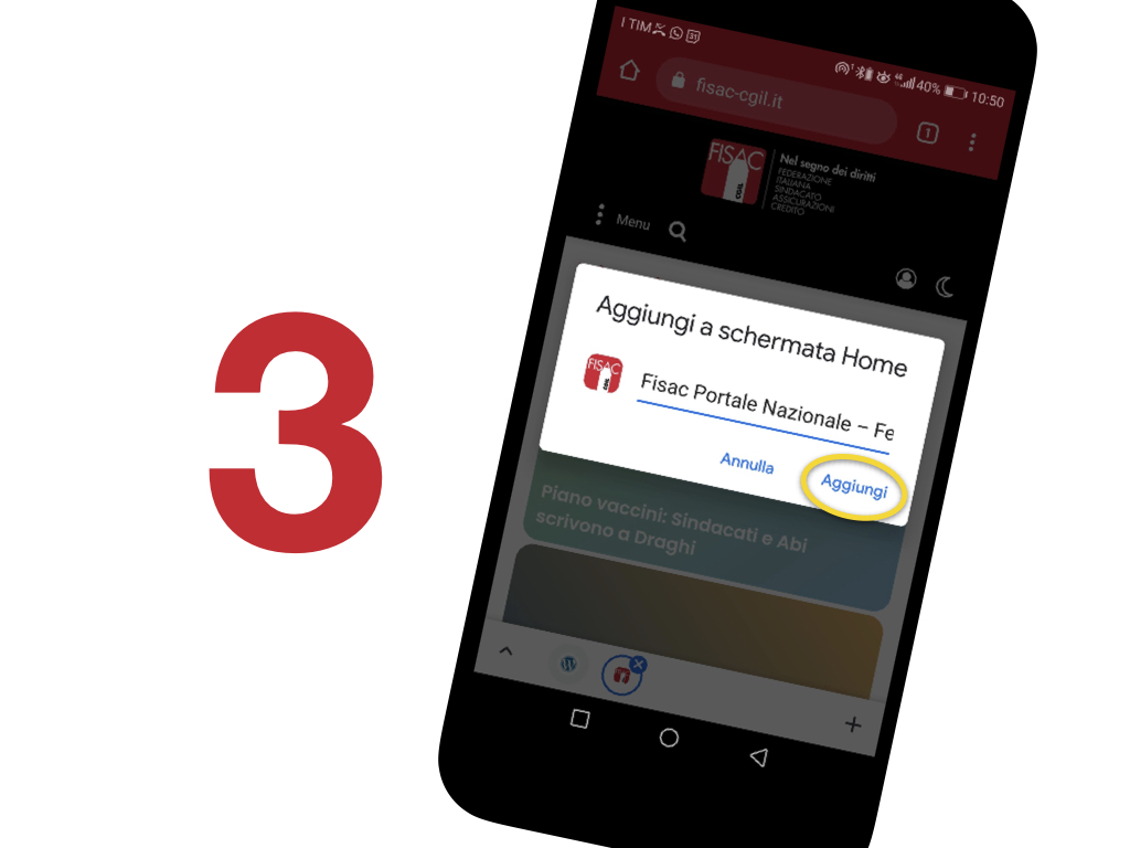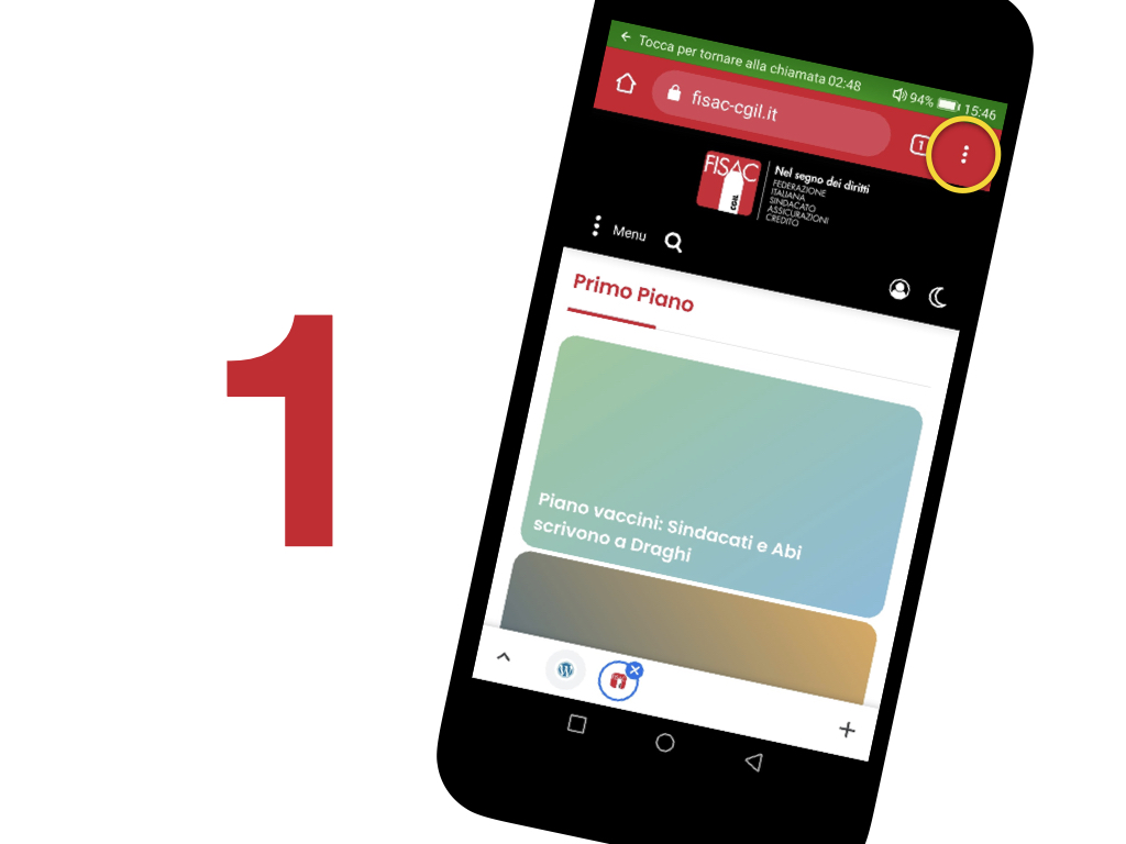 Apri il sito Fisac CGIL Groupama sul tuo cellulare (ci puoi arrivare anche cercando su google: “Fisac Groupama”) e clicca sul pulsante con i tre puntini