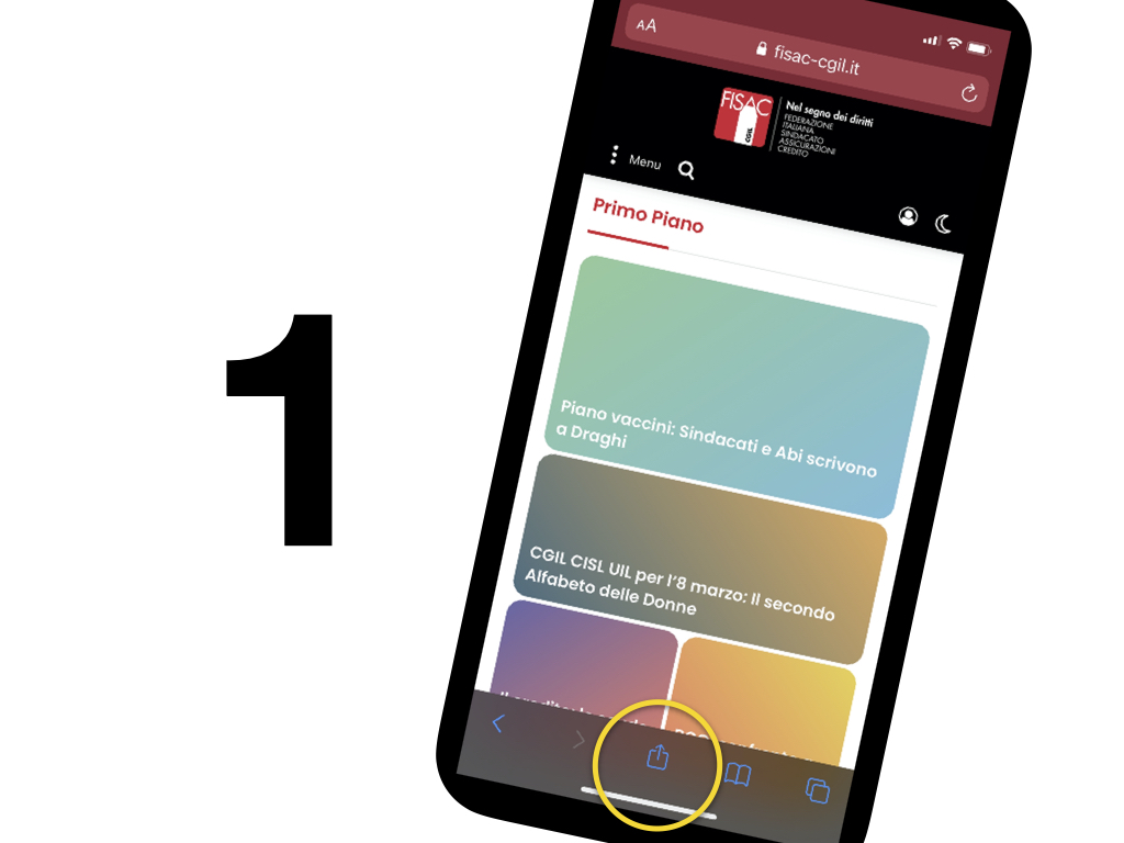 Apri il sito Fisac Cgil – Groupama sul tuo cellulare (ci puoi arrivare anche cercando su google: “Fisac Groupama”) e clicca sul pulsante di condivisione.
