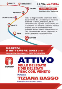 Si è tenuto nella giornata di lunedì 5 settembre un importante Attivo delle delegate e dei delegati della Fisac CGIL del Veneto, con la presenza e gli interventi della Segreteria Regionale Fisac al completo, del Segretario confederale Paolo Righetti e di Tiziana Basso, Segretaria Generale della CGIL del Veneto, che ne ha curato le conclusioni.