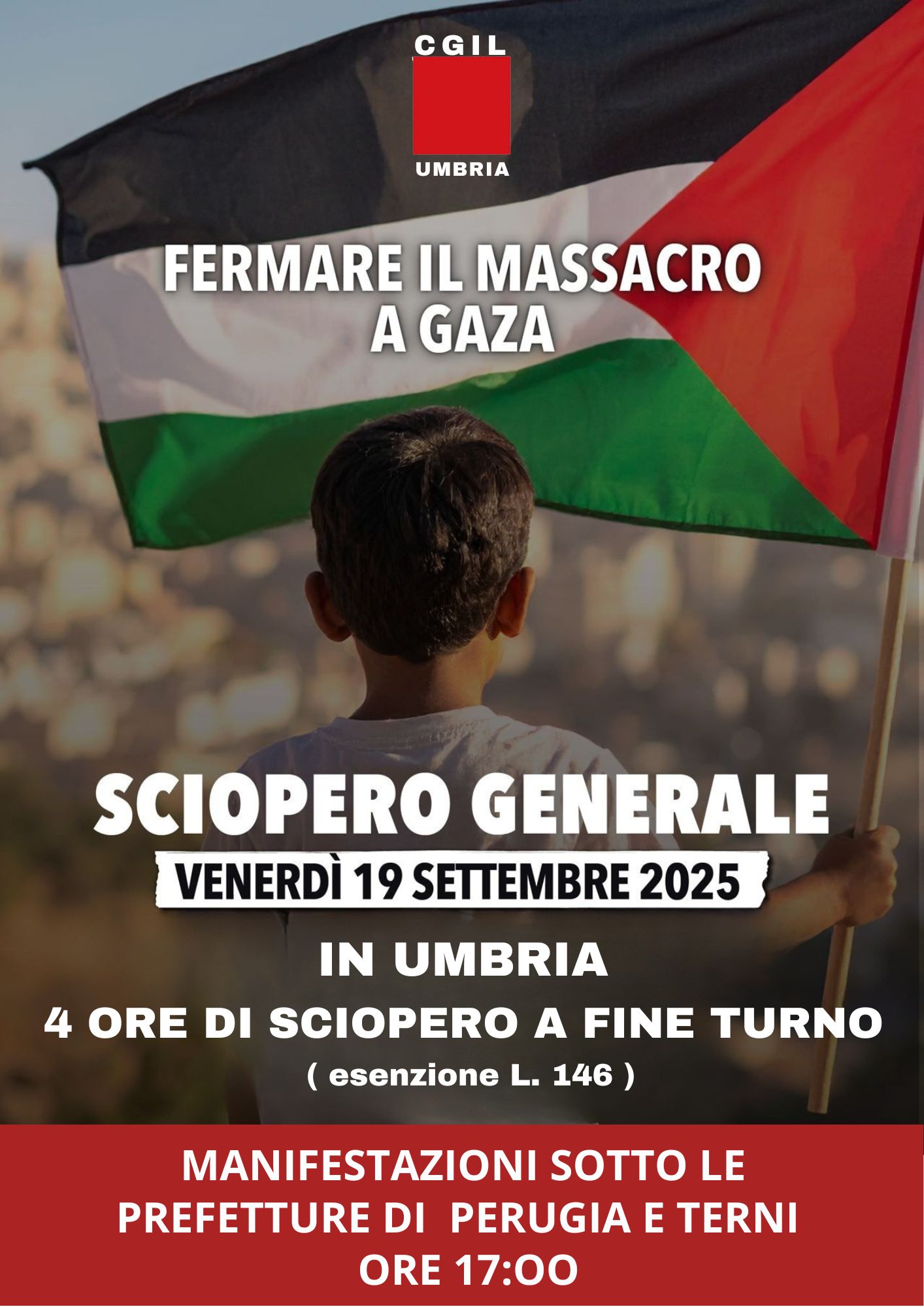 Potrebbe essere un'immagine raffigurante 1 persona e il seguente testo "CGIL UMBRIA FERMARE IL MASSACRO A GAZA SCIOPERO GENERALE VENERDÌ 19 SETTEMBRE 2025 IN UMBRIA 4 ORE DI SCIOPERO A FINE TURNO esenzione L. 146) MANIFESTAZIONI SOTTO LE PREFETTURE DI PERUGIA E TERNI ORE 17:00"