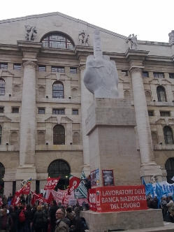 della bella manifestazione davanti alla borsa di Milano, simbolo della finananza e dei banchieri che hanno messo in ginocchio l’economia reale ed oggi minacciano di far pagare i loro errori ai lavoratori.Si noti il monumento in mezzo alla piazza da cui i manifestanti traevano ispirazione.