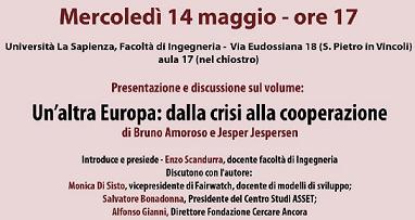 Il 14 prossimo alle 17,30, presso la facoltà di Ingegneria, in via Eudossiana, sarà presentato il volume di Bruno Amoroso e Jesper Jespersen, “Un’Europa Possibile dalla crisi alla cooperazione”.
