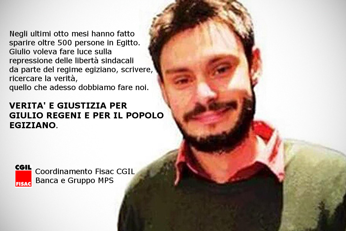 La Fisac Cgil della Banca e del Gruppo MPS ritiene indispensabile un impegno collettivo affinché emerga la verità sull’omicidio di Giulio Regeni e sulle relai condizioni del popolo egiziano. Da questo link potete scaricare l’immagine e condividerla.