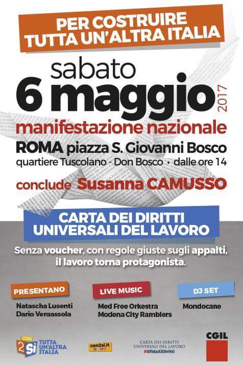 “Carta dei Diritti Universali del Lavoro”, un nuovo Statuto di tutte le Lavoratrici e di tutti i Lavoratori. L’appuntamento è in piazza San Giovanni Bosco dalle ore 14, concluderà il segretario generale della Cgil Susanna Camusso.