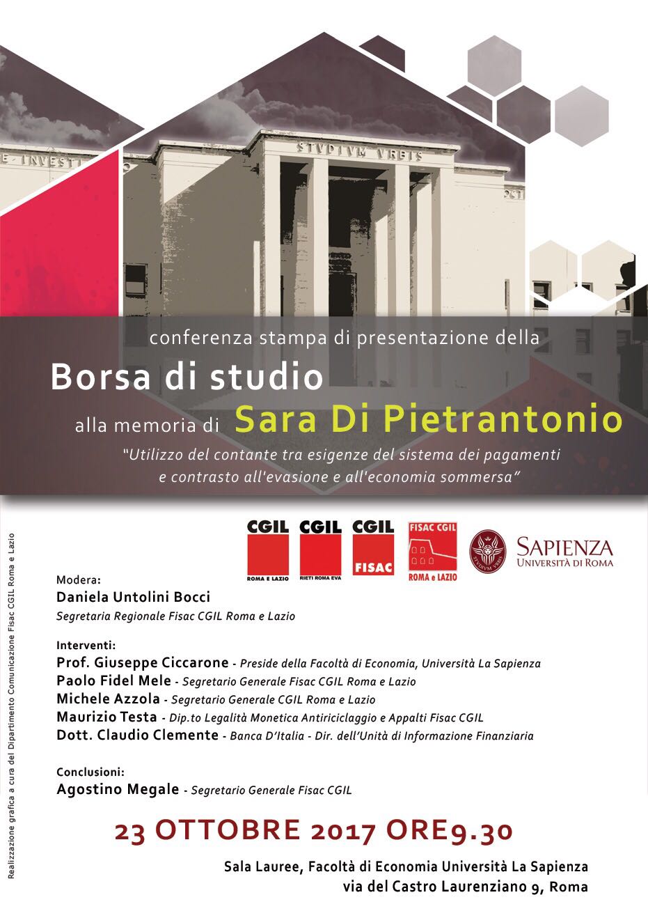 Vi invitiamo, quindi, a partecipare alla conferenza stampa che si svolgerà il giorno 23 ottobre 2017 alle ore 9,30 presso la sala delle Lauree della Facoltà di Economia Università La Sapienza – Via del Castro Laurenziano 9 – Roma.