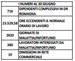 MALATTIE: la nostra DR continua a riportare dati estremamente allarmanti sulle malattie. 2633 giornate già al 30 giugno 2019, in aumento esponenziale rispetto al dato già preoccupante delle 2286 giornate registrate a fine 2018. Inoltre il fenomeno di malattia/infortuni interessa già oggi 380 colleghi, pari al 53% dell’organico in carico alla DR Romagna. La salute dei colleghi per noi viene al primo posto e, come avevamo già scritto in occasione dell’incontro precedente. Si tratta di numeri che mai erano stati rilevati nelle nostre realtà e che evidenziano, a nostro parere, un probabile notevole disagio dei colleghi;