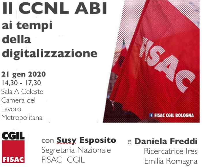 Invitiamo a partecipare Martedì 21 gennaio, dalle ore 14,30 alle 17,30, presso la sala A.Celeste della CGIL di Bologna, al seminario sulla piattaforma di Rinnovo del CCNL ABI, con il prezioso contributo di Susy Esposito della Segreteria Nazionale della FISAC CGIL.