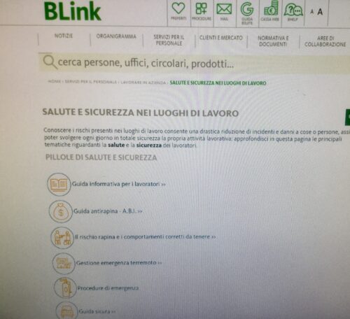 Nel caso non fosse stato messo sufficientemente in evidenza, segnalo a tutti che da ieri è stata pubblicata, su Blink, una nuova pagina che riassume i contenuti informativi in materia di Salute e Sicurezza (solo in parte già presenti).