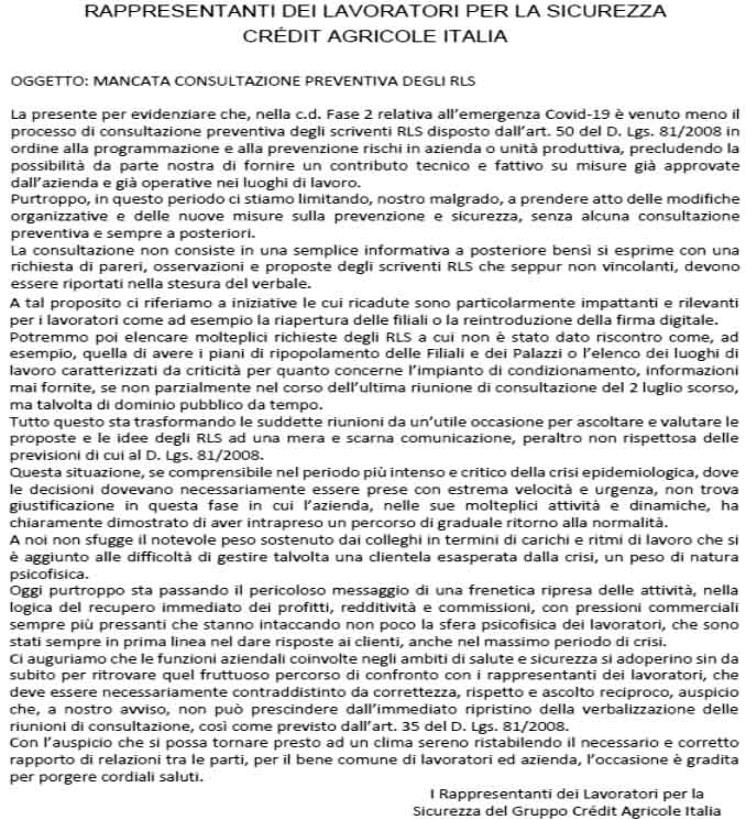 Nella giornata di ieri i Rappresentanti dei Lavoratori per la Sicurezza hanno evidenziato all’azienda la mancanza di consultazione, la mancanza di riscontri alle varie richieste, il maturare del pericoloso messaggio di una frenetica ripresa delle attività, nella logica del recupero immediato dei profitti, redditività e commissioni, con pressioni commerciali sempre più pressanti che stanno intaccando non poco la sfera psicofisica dei lavoratori, che sono stati sempre in prima linea nel dare risposte ai clienti, anche nel massimo periodo di crisi.